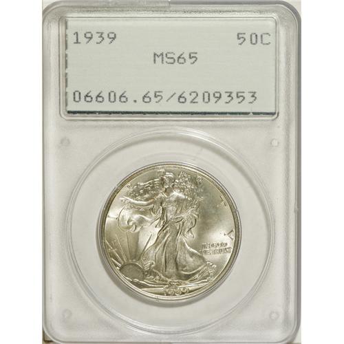 <B>1939 50C MS65 PCGS.</B></I> PCGS Population (1434/1184). NGC Census: (2016/1716). Mintage: 6,820,808. Numismedia Wsl. Price for NGC/PCGS coin in MS65: $220. (#6606)<BR><BR><b>Shipping:</b> Coins & Currency (<a target="_blank" href="http://www.heritageauctions.com/common/shipping.php">view shipping information</a>)