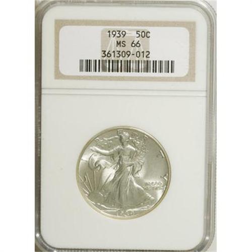 <B>1939 50C MS66 NGC.</B></I> NGC Census: (641/219). PCGS Population (978/206). Mintage: 6,820,808. Numismedia Wsl. Price for NGC/PCGS coin in MS66: $460. (#6606)<BR><BR><b>Shipping:</b> Coins & Currency (<a target="_blank" href="http://www.heritageauctions.com/common/shipping.php">view shipping information</a>)