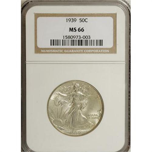 <B>1939 50C MS66 NGC.</B></I> NGC Census: (646/219). PCGS Population (986/209). Mintage: 6,820,808. Numismedia Wsl. Price for NGC/PCGS coin in MS66: $460. (#6606)<BR><BR><B>Coin Engraver:</B> Adolph A. Weinman<BR><BR><b>Shipping:</b> Coins & Currency (<a target="_blank" href="http://www.heritageauctions.com/common/shipping.php">view shipping information</a>)