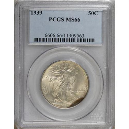 <B>1939 50C MS66 PCGS.</B></I> PCGS Population (978/206). NGC Census: (644/219). Mintage: 6,820,808. Numismedia Wsl. Price for NGC/PCGS coin in MS66: $460. (#6606)<BR><BR><B>Coin Engraver:</B> Adolph A. Weinman<BR><BR><b>Shipping:</b> Coins & Currency (<a target="_blank" href="http://www.heritageauctions.com/common/shipping.php">view shipping information</a>\)
