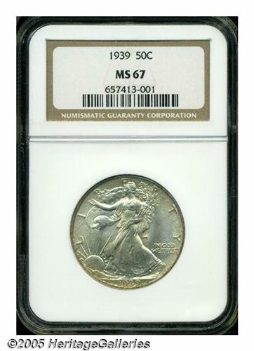 <B>1939<50C> MS67 NGC.</B></I> Blushes of golden-brown color grace this boldly struck and lustrous Superb Gem. Well preserved, and difficult to procure any finer.