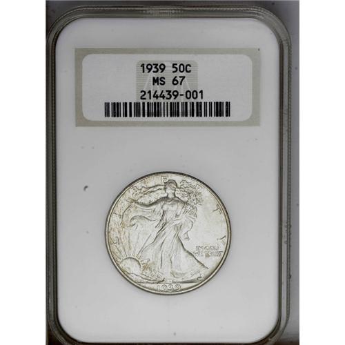 <B>1939<50C> MS67 NGC.</B></I> Radiantly lustrous surfaces are visited by whispers of golden-brown toning which do not impede the marvelous luster in the least. The design elements are sharply impressed, including excellent definition on Liberty's left thumb and in the gown lines. A minute milling mark in the right obverse field is mentioned for accuracy. NGC has seen 13 pieces grading higher (3/06). <BR><BR><B>Important notice:</B> Heritage usually auctions material at the rate of 200-250 lots per hour. On some occasions eBay Live bid software or the Internet may not be able to keep up with the pace of the auction. We recommend placing a realistic absentee bid now as insurance to avoid disappointment. Occasionally the auctioneer may eliminate or reject an eBay Live bid, and the auctioneer may also reopen a lot after the close of the eBay live bidding (usually because we missed an audience bid), and may reject your bid even if it shows you as the winning bidder. By bidding via eBay Live, you agree that Heritage may award the lot to another bidder at its sole discretion under the circumstances described above or any other reasonable circumstances. Since eBay bids are not shown to us until we open the lot on the floor, we treat those bids just like floor bids. In most cases the floor responds before the eBay bid is presented to us, due to Internet lag time, so for consistency we have made it a policy that floor bids are always considered first over tie eBay live bids. Also please note that all Heritage lots purchased through eBay Live carry a 20% Buyer's Premium. Please make sure you read the Terms and Conditions before you bid. This lot is being auctioned in conjunction with a live floor auction by Heritage Galleries & Auctioneers. All final auction and invoice information will be supplied by Heritage Galleries & Auctioneers, and all other information should be considered preliminary. Lot:2977 <BR><BR><B>Winning Notification and Billing:</B> After the FINAL session in this auction is complete, Heritage will send e-mail and snail mail invoices. This process normally takes several days. All final auction and invoice information will be supplied by Heritage Galleries & Auctioneers, and all other information should be considered preliminary. <BR><BR>This auction will be conducted on a live auction floor and over the Internet through eBay Live. If you choose to place an absentee bid, please take a moment to <font color='#0000ff'><u><a href='http://pages.ebay.com/liveauctions/help/before/laabsentee.html'>learn how eBay Live absentee bidding works</a></u></font><font color='#000000'>