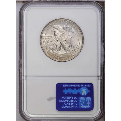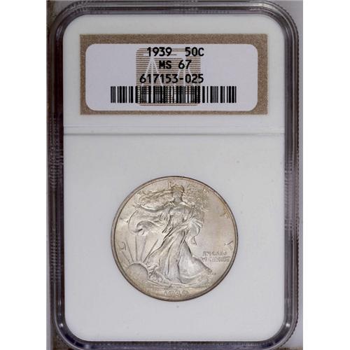 1939 50C MS67 NGC. The luster is satiny and there is a 1939[50C] MS67 NGC.