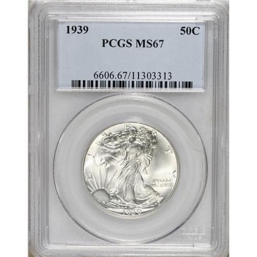 <B>1939 50C MS67 PCGS.</B></I> This well struck Superb Gem is remarkably void of contact, and would upgrade even an advanced cabinet of Walking Liberty halves. A mere wisp of gold patina denies absolute brilliance.<BR><BR><b>Shipping:</b> Coins & Currency (<a target="_blank" href="http://www.heritageauctions.com/common/shipping.php">view shipping information</a>)