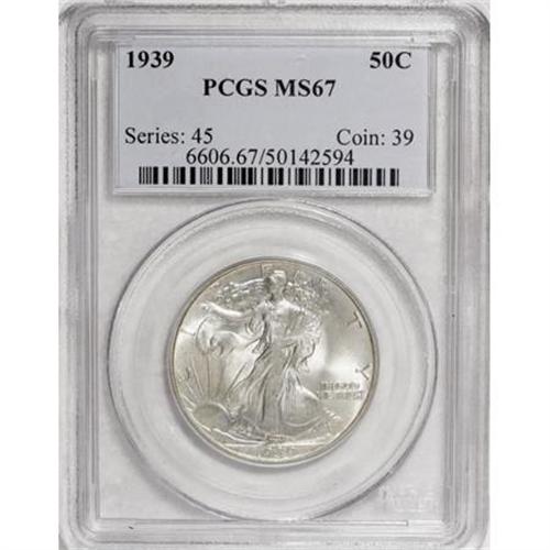 <B>1939 50C MS67 PCGS.</B></I> PCGS Population (197/17). NGC Census: (204/18). Mintage: 6,820,808. Numismedia Wsl. Price for NGC/PCGS coin in MS67: $700. (#6606)<BR><BR><B>Coin Engraver:</B> Adolph A. Weinman<BR><BR><b>Shipping:</b> Coins & Currency (<a target="_blank" href="http://www.heritageauctions.com/common/shipping.php">view shipping information</a>)