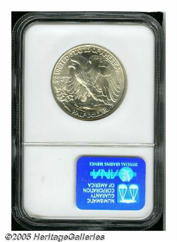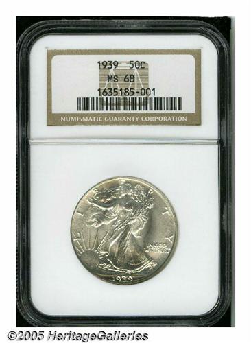 <B>1939<50C> MS68 NGC.</B></I> This is an outstanding Superb Gem with brilliant and frosty silver luster. There is no evidence of toning on either side of this sharply struck example. Although the date is considered to be common, it is seldom seen as nice as this. Our auction archives, kept over the last 12 years, list just over 200 examples of this date sold by us, yet this is only the 12th example to appear in MS68 grade, about one a year. Population: 14 in 68, 0 finer (6/05).<BR><I>From The Robert Moreno Collection.</B></I>