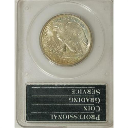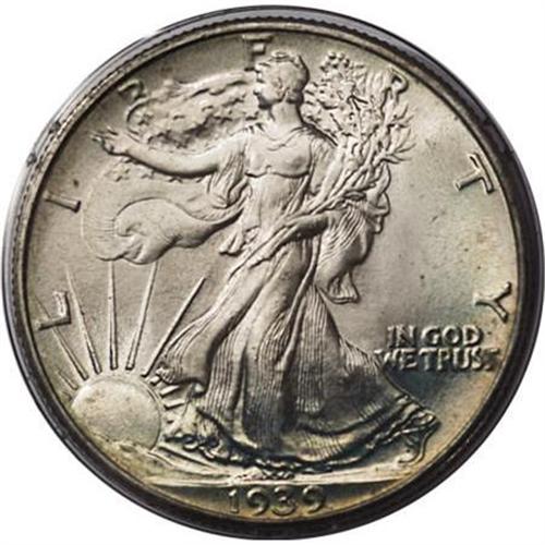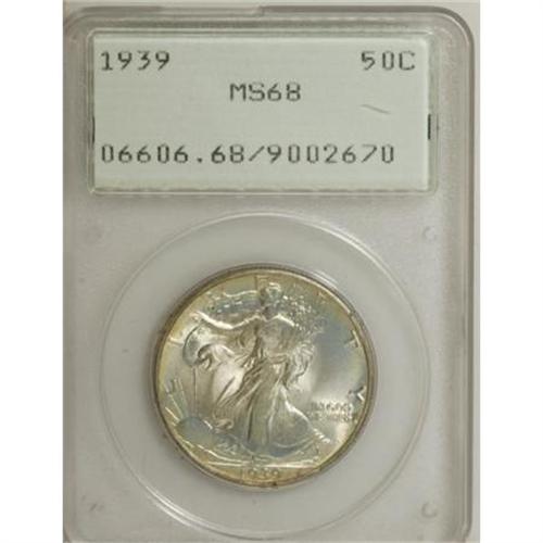 <B>1939 50C MS68 PCGS.</B></I> Iridescent olive and pale orange toning endows this lustrous and splendidly smooth Superb Gem. The strike is about as sharp as can be found on a Walking Liberty half, since the head and skirt lines are fully brought up, and even the index finger of the branch hand has good definition. Encapsulated in a first-generation holder. Population: 17 in 68, 0 finer (6/07).<BR><BR><B>Coin Engraver:</B> Adolph A. Weinman<BR><BR><b>Shipping:</b> Coins & Currency (<a target="_blank" href="http://www.heritageauctions.com/common/shipping.php">view shipping information</a>\)
