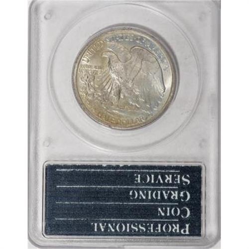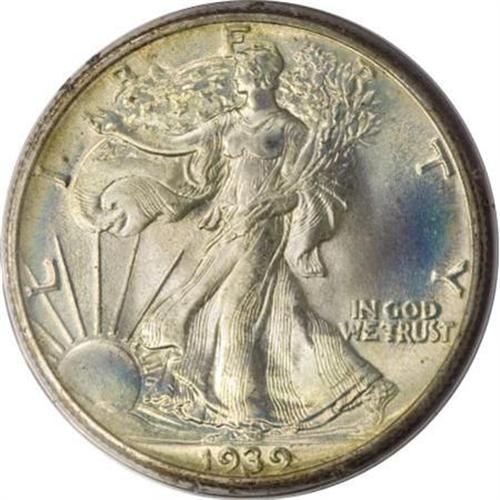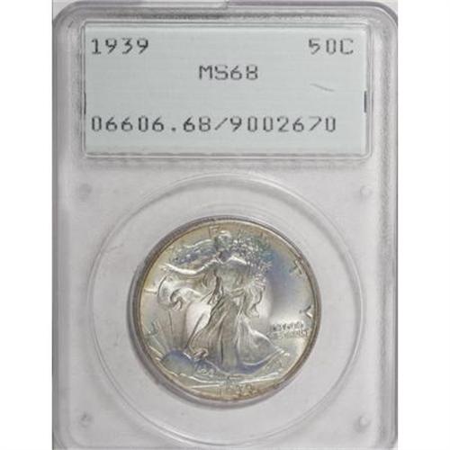 <B>1939 50C MS68 PCGS.</B></I> Iridescent olive and pale orange toning endows this lustrous and splendidly smooth Superb Gem. The strike is about as sharp as can be found on a Walking Liberty half, since the head and skirt lines are fully brought up, and even the index finger of the branch hand has good definition. Encapsulated in a first-generation holder. Population: 17 in 68, 0 finer (10/07).<BR><BR><B>Coin Engraver:</B> Adolph A. Weinman<BR><BR><b>Shipping:</b> Coins & Currency (<a target="_blank" href="http://www.heritageauctions.com/common/shipping.php">view shipping information</a>)