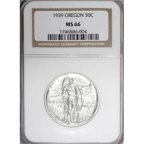 <B>1939 50C Oregon MS66 NGC.</B></I> NGC Census: (277/86). PCGS Population (243/69). Mintage: 3,004. Numismedia Wsl. Price for NGC/PCGS coin in MS66: $725. (#9352)<BR><BR><b>Shipping:</b> Coins & Currency (<a target="_blank" href="http://www.heritageauctions.com/common/shipping.php">view shipping information</a>)