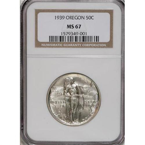 <B>1939 50C Oregon MS67 NGC.</B></I> A solidly struck and surprisingly appealing steel-gray Superb Gem representative from the final year of the Oregon design. The overall preservation is magnificent. NGC has certified four finer examples (12/07).<BR><BR><b>Shipping:</b> Coins & Currency (<a target="_blank" href="http://www.heritageauctions.com/common/shipping.php">view shipping information</a>)
