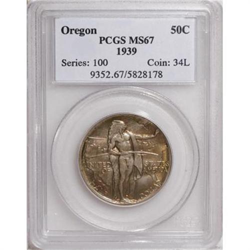 <B>1939 50C Oregon MS67 PCGS.</B></I> Well struck with lovely multicolored iridescence on the obverse, where bright orange, crimson, sea-green and medium gray are evident. The reverse displays beautiful olive and autumn-brown hues. Decisively struck and gorgeously preserved. Population: 50 in 67, 3 finer (10/03).<BR><I>From The Cary & Cheryl Porter Collection, Part Three.</B></I><BR><BR><b>Shipping:</b> Coins & Currency (<a target="_blank" href="http://www.heritageauctions.com/common/shipping.php">view shipping information</a>\)
