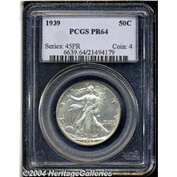 <B>1939<50C> PR64 PCGS.</B></I> A lovely proof specimen, fully struck with mildly reflective fields, some of which display a milky haze. Few hairlines and handling marks are in evidence. <BR><BR><B>Important notice:</B> Heritage usually auctions material at the rate of 200-250 lots per hour. On some occasions eBay Live bid software or the Internet may not be able to keep up with the pace of the auction. We recommend placing a realistic absentee bid now as insurance to avoid disappointment. Occasionally the auctioneer may eliminate or reject an eBay Live bid, and the auctioneer may also reopen a lot after the close of the eBay live bidding (usually because we missed an audience bid), and may reject your bid even if it shows you as the winning bidder. By bidding via eBay Live, you agree that Heritage may award the lot to another bidder at its sole discretion under the circumstances described above or any other reasonable circumstances. Since eBay bids are not shown to us until we open the lot on the floor, we treat those bids just like floor bids. In most cases the floor responds before the eBay bid is presented to us, due to Internet lag time, so for consistency we have made it a policy that floor bids are always considered first over tie eBay live bids. Also please note that all Heritage lots purchased through eBay Live carry a 20% Buyer's Premium. Please make sure you read the Terms and Conditions before you bid.