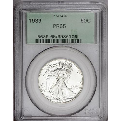 <B>1939<50C> PR65 PCGS.</B></I> A precisely struck and untoned older holder Gem. Only a few nearly imperceptible hairlines on the right obverse field deny perfection.