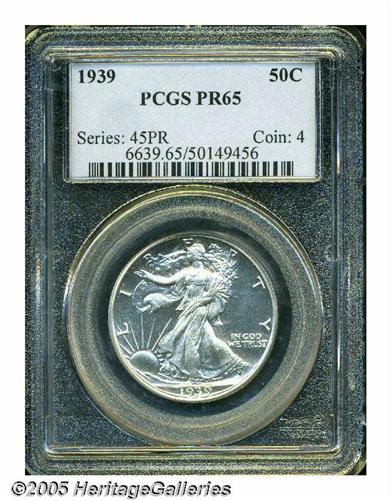 <B>1939<50C> PR65 PCGS.</B></I> Immaculate, essentially untoned surfaces that come as near to perfection as one is likely to find on a proof Walking Liberty. Fully struck with watery fields and a slight cameo contrast on both sides.