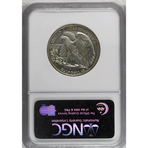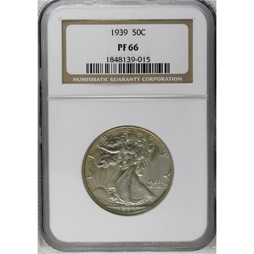 <B>1939<50C> PR66 NGC.</B></I> This bright proof displays an occasional splash of milky-tan color and razor-sharp motifs. Close examination reveals no significant marks.