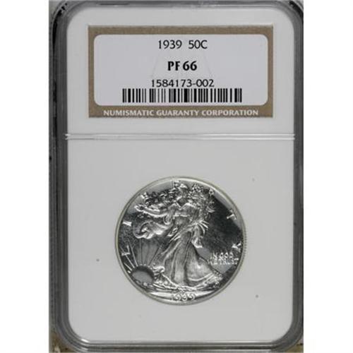 <B>1939 50C PR66 NGC.</B></I> An impressive Premium Gem specimen from this mid-date proof Walking Liberty half dollar issue, crisply struck with only a hint of haze over gleaming, chrome-like mirrors. One of just 8,808 pieces coined.<BR><BR><B>Coin Engraver:</B> Adolph A. Weinman<BR><BR><b>Shipping:</b> Coins & Currency (<a target="_blank" href="http://www.heritageauctions.com/common/shipping.php">view shipping information</a>)