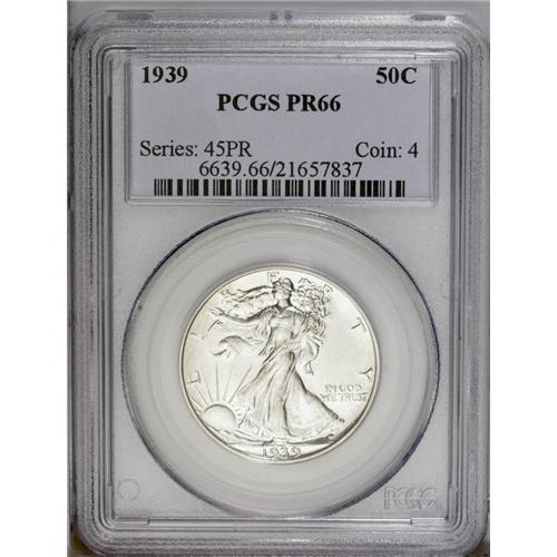 <B>1939<50C> PR66 PCGS.</B></I> Completely brilliant and well struck on both sides. While the obverse has no noticeable contrast between the devices and fields, the reverse devices are fairly frosty. A superlative Premium Gem proof example of this prewar issue. <BR><BR><B>Important notice:</B> Heritage usually auctions material at the rate of 200-250 lots per hour. On some occasions eBay Live bid software or the Internet may not be able to keep up with the pace of the auction. We recommend placing a realistic absentee bid now as insurance to avoid disappointment. Occasionally the auctioneer may eliminate or reject an eBay Live bid, and the auctioneer may also reopen a lot after the close of the eBay live bidding (usually because we missed an audience bid), and may reject your bid even if it shows you as the winning bidder. By bidding via eBay Live, you agree that Heritage may award the lot to another bidder at its sole discretion under the circumstances described above or any other reasonable circumstances. Since eBay bids are not shown to us until we open the lot on the floor, we treat those bids just like floor bids. In most cases the floor responds before the eBay bid is presented to us, due to Internet lag time, so for consistency we have made it a policy that floor bids are always considered first over tie eBay live bids. Also please note that all Heritage lots purchased through eBay Live carry a 20% Buyer's Premium. Please make sure you read the Terms and Conditions before you bid. This lot is being auctioned in conjunction with a live floor auction by Heritage Galleries & Auctioneers. All final auction and invoice information will be supplied by Heritage Galleries & Auctioneers, and all other information should be considered preliminary. Lot:3046 <BR><BR><B>Winning Notification and Billing:</B> After the FINAL session in this auction is complete, Heritage will send e-mail and snail mail invoices. This process normally takes several days. All final auction and invoice information will be supplied by Heritage Galleries & Auctioneers, and all other information should be considered preliminary. <BR><BR>This auction will be conducted on a live auction floor and over the Internet through eBay Live. If you choose to place an absentee bid, please take a moment to <font color='#0000ff'><u><a href='http://pages.ebay.com/liveauctions/help/before/laabsentee.html'>learn how eBay Live absentee bidding works</a></u></font><font color='#000000'>