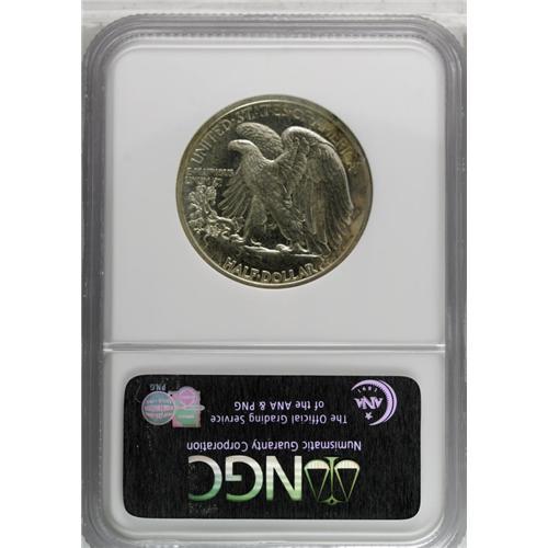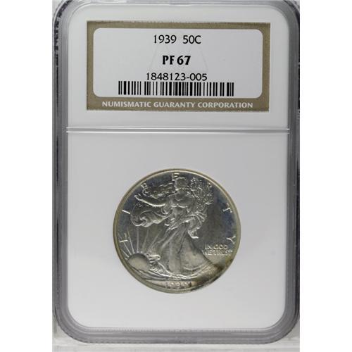 <B>1939<50C> PR67 NGC.</B></I> An elegant and nearly perfect Superb Gem with deep mirrors. Faint milky patina over both sides is augmented by golden rim toning, with deep maroon toning to the right of the date and extending past the sandal.