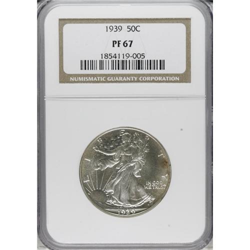 <B>1939 50C PR67 NGC.</B></I> The famously elegant design features are fully brought up on both sides of this Superb Gem proof specimen. Other than a few splashes of red-orange patina, near the borders, the surfaces are largely untoned. Handling marks and hairlines are virtually nonexistent.<BR><BR><b>Shipping:</b> Coins & Currency (<a target="_blank" href="http://www.heritageauctions.com/common/shipping.php">view shipping information</a>)