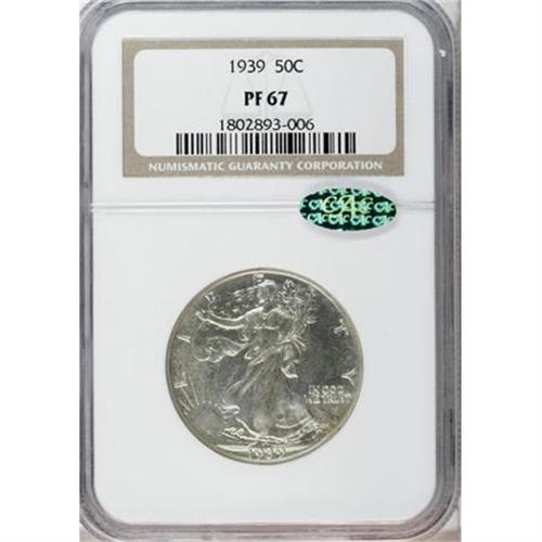 <B>1939 50C PR67 NGC. CAC.</B></I> Wispy golden toning covers both surfaces of this exceptional Superb Gem proof. The details are bold and the devices are finely lustrous. NGC has only certified 76 finer examples, that are only a tad better than this specimen.<BR><BR><B>Coin Engraver:</B> Adolph A. Weinman<BR><BR><b>Shipping:</b> Coins & Currency (<a target="_blank" href="http://www.heritageauctions.com/common/shipping.php">view shipping information</a>)