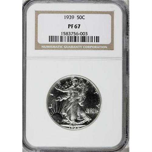 <B>1939 50C PR67 NGC.</B></I> A sensational Superb Gem proof with amazing silver brilliance and deeply mirrored fields. The reflective devices have a hint of silver luster, resulting in a trace of cameo contrast on both sides. <BR><BR><B>Coin Engraver:</B> Adolph A. Weinman<BR><BR><b>Shipping:</b> Coins & Currency (<a target="_blank" href="http://www.heritageauctions.com/common/shipping.php">view shipping information</a>)
