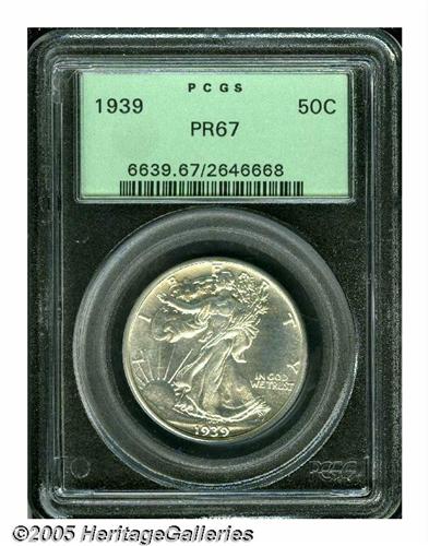<B>1939<50C> PR67 PCGS.</B></I> Brilliant throughout and very flashy with exceptionally deep mirrors in the fields. A wispy blemish on Liberty's breast is the only visible disturbance. Housed in a green label holder.