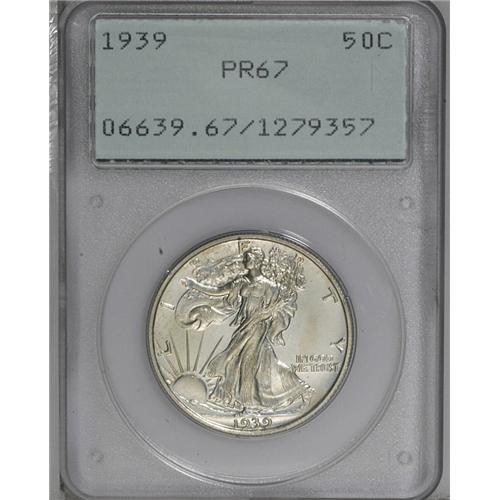 <B>1939<50C> PR67 PCGS.</B></I> Dark green-gold and lighter seafoam patina adorns this Superb Gem with seemingly bottomless mirrors. A lovely example housed in an early holder.