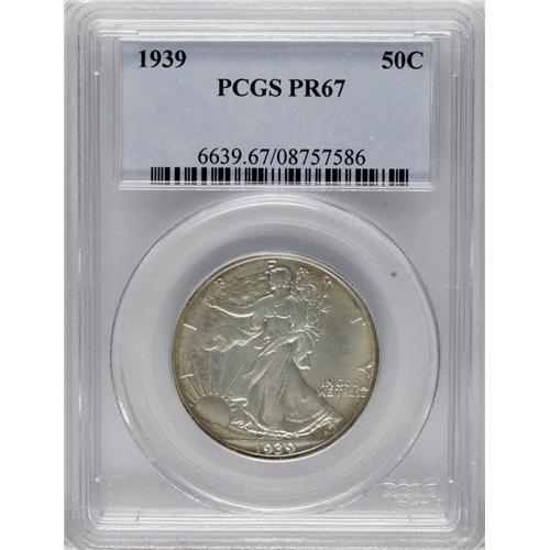 <B>1939 50C PR67 PCGS.</B></I> Fully struck with a coating of opaque, creamy coloration over both sides. Nearly flawless, although a small mark is noted just below Liberty's outstretched arm and flowing cape.<BR><BR><b>Shipping:</b> Coins & Currency (<a target="_blank" href="http://www.heritageauctions.com/common/shipping.php">view shipping information</a>)