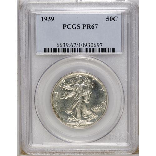 <B>1939 50C PR67 PCGS.</B></I> Impressive striking qualities and impeccably preserved surfaces lend great eye appeal to this Superb Gem. Close examination reveals traces of speckled milky-tan color around the peripheries.<BR><BR><b>Shipping:</b> Coin/Currency (<a target="_blank" href="http://www.heritageauctions.com/common/shipping.php">view shipping information</a>)
