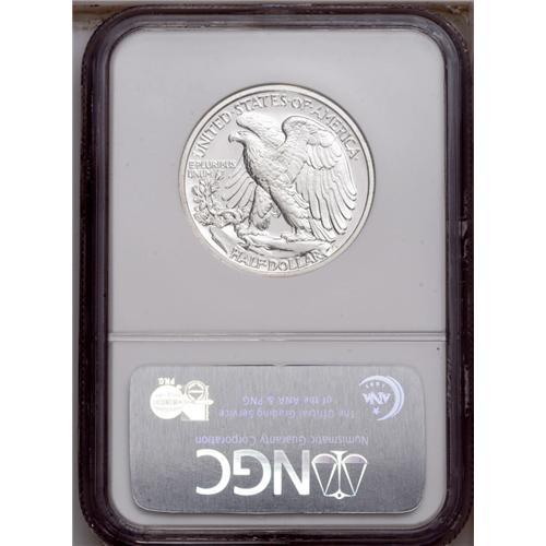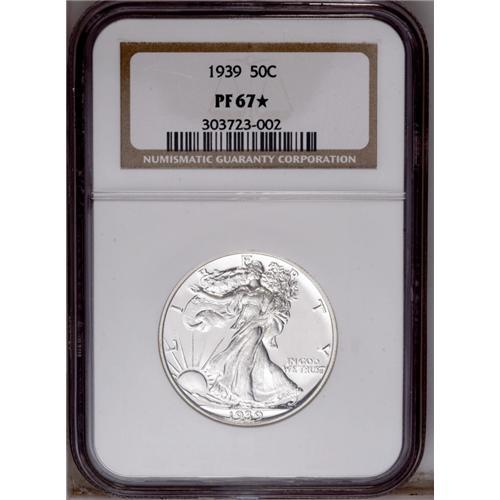 <B>1939<50C> PR67 <img border='0' src='http://www.heritagecoins.com/images/star.gif' width=10 height=10> NGC.</B></I> A boldly struck and brilliant Superb Gem. The Walking Liberty device possesses substantial frost, which provides noticeable contrast with the mirrored field. This attribute likely secured the Star designation from NGC.