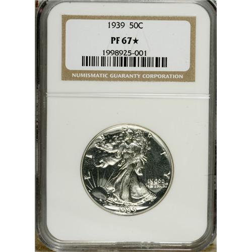 <B>1939 50C PR67 <img border='0' src='http://www.heritagecoins.com/images/star.gif' width=10 height=10> NGC.</B></I> This brilliant and immaculate Superb Gem is noteworthy for its moderate cameo contrast. Although undesignated as a Cameo by NGC, this attribute is presumably the reason why it has received a Star designation from NGC.<BR><BR><b>Shipping:</b> Coins & Currency (<a target="_blank" href="http://www.heritageauctions.com/common/shipping.php">view shipping information</a>)