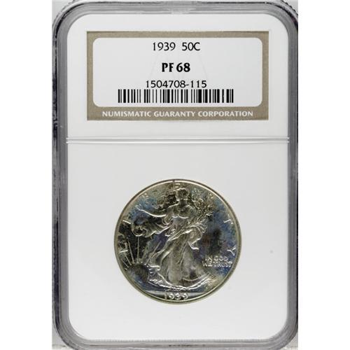 <B>1939 50C PR68 NGC.</B></I> Just a tinge of ice-blue and gold graces each side of this Superb Gem proof half dollar, while the fields are brilliantly mirrored. Unusually for a proof of this era, light mint frost coats the devices, creating mild contrast that is unacknowledged by NGC. Census: 66 in 68, 1 finer (1/07).<BR><BR><b>Shipping:</b> Coins & Currency (<a target="_blank" href="http://www.heritageauctions.com/common/shipping.php">view shipping information</a>)