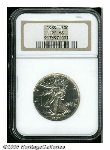 <B>1939<50C> PR68 NGC.</B></I> This fully struck and Superb Gem is absolutely brilliant with deeply mirrored fields and slight cameo contrast. It is nearly the finest known with only one finer example certified. Population: 47 in 68, 1 finer (6/05).<BR><I>From The Robert Moreno Collection.</B></I>