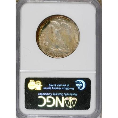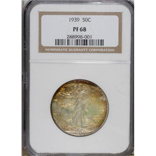 <B>1939 50C PR68 NGC.</B></I> 1939 proof half dollars, with a mintage of 8,808 pieces, are quite plentiful, right through the PR67 level. The certified population drops precipitously in PR68. A thin coat of pastel multicolored toning bathes both sides of this sharply impressed specimen. Close inspection reveals no marks worthy of note. Census: 70 in 68, 1 finer (5/07).<BR><BR><b>Shipping:</b> Coins & Currency (<a target="_blank" href="http://www.heritageauctions.com/common/shipping.php">view shipping information</a>)