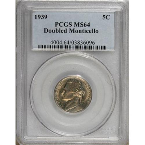 <B>1939 5C Doubled MONTICELLO MS64 PCGS.</B></I> FS-022. FIVE CENTS and MONTICELLO are broadly die doubled. This piece is well struck with a typical orange-peel texture (as made) in the fields. Streaky champagne and aqua toning occurs on each side. A few small abrasions on the reverse limit the grade. <BR><BR><b>Shipping:</b> Coins & Currency (<a target="_blank" href="http://www.heritageauctions.com/common/shipping.php">view shipping information</a>)