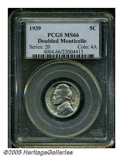 <B>1939<5C> Doubled MONTICELLO MS66 PCGS.</B></I> FS-022. Faint grape and yellow color lends a pleasing tonality to this highly lustrous Superb-Gem example. A dramatic doubled-die, visible to a sharp unaided eye. Population: 22 in 66, 4 finer (6/05).