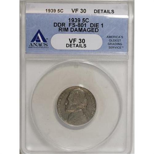 <B>1939 5C Doubled MONTICELLO--Rim Damaged--ANACS VF30 Details.</B></I> FS-801. NGC Census: (0/46). PCGS Population (6/227). (#4004)<BR><BR><B>Coin Engraver:</B> Felix Schlag<BR><BR><b>Shipping:</b> Coins & Currency (<a target="_blank" href="http://www.heritageauctions.com/common/shipping.php">view shipping information</a>)