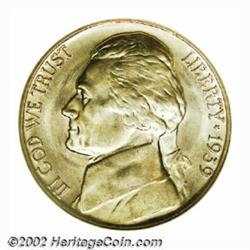 1939 5C MS68 NGC. This is an immaculate example that has the barest hint of light golden color. Just a wonderful example and unexcelled by any other coins from either NGC or PCGS (7/02). Well struck but not quite complete over the steps of Monticello.Ex: Central States (Heritage, 4/02), lot 5397. Important notice: We expect to be auctioning lots at the rate of 200-250 per hour. Sometimes eBay Premier live bid software cannot keep up with that pace, so we strongly recommend that you place a realistic proxy bid now as insurance to avoid disappointment. Also please note that all Heritage/CAA lots purchased through eBay Premier carry a 20% Buyer's Premium. Please make sure you read the Terms and Conditions.