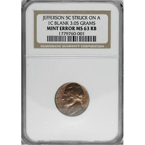 <B>Undated Jefferson Nickel--Struck on a Cent Blank--MS63 Red and Brown NGC. </B></I>3.05 Grams.<BR><BR><B>Coin Engraver:</B> Felix Schlag<BR><BR><b>Shipping:</b> Coins & Currency (<a target="_blank" href="http://www.heritageauctions.com/common/shipping.php">view shipping information</a>)