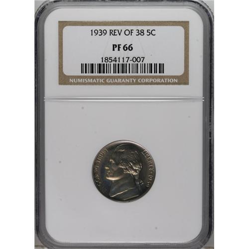 <B>1939 5C Reverse of 1938 PR66 NGC.</B></I> NGC Census: 367 in 66, 147 finer (3/07).PCGS Population: 667 in 66, 210 finer (3/07).(4175).<BR><BR><b>Shipping:</b> Coins & Currency (<a target="_blank" href="http://www.heritageauctions.com/common/shipping.php">view shipping information</a>)