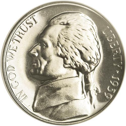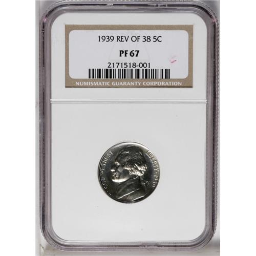 <B>1939<5C> Reverse of 1938 PR67 NGC.</B></I> The so-called "wavy steps" variety. A boldly struck and exceptionally preserved Superb Gem that has pronounced steel-blue and faint apricot colors. Struck from slightly rotated dies.