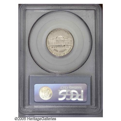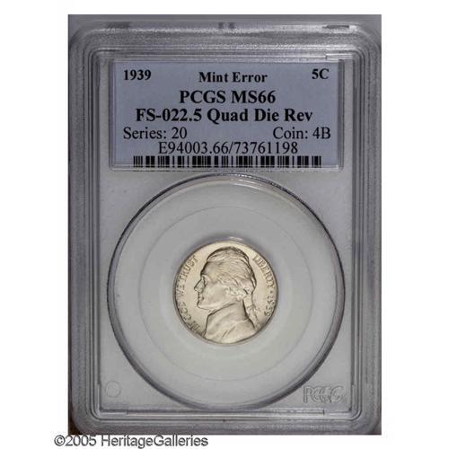 <B>1939<5C> Reverse of 1940 Jefferson Nickel--Quadrupled Die Reverse--MS66 PCGS.</B></I> FS-022.5. The reverse legends are noticeably die quadrupled. This lustrous and nearly immaculate premium Gem has a good strike, although the steps of Monticello are not full.