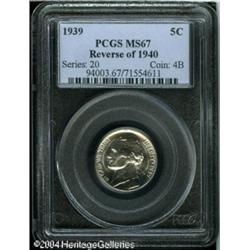 1939 5C Reverse of 1940 MS67 PCGS. Beautiful lustr <B>1939 5C Reverse of 1940 MS67 PCGS.</B></I> Beautiful lustrous, virtually white surfaces. Nicely struck design features, with no mentionable marks. Population: 11 in 67, 0 finer (11/04). <BR><BR><B>Important notice:</B> Heritage usually auctions material at the rate of 200-250 lots per hour. On some occasions eBay Live bid software or the Internet may not be able to keep up with the pace of the auction. We recommend placing a realistic absentee bid now as insurance to avoid disappointment. Occasionally the auctioneer may eliminate or reject an eBay Live bid, and the auctioneer may also reopen a lot after the close of the eBay live bidding (usually because we missed an audience bid), and may reject your bid even if it shows you as the winning bidder. By bidding via eBay Live, you agree that Heritage may award the lot to another bidder at its sole discretion under the circumstances described above or any other reasonable circumstances. Since eBay bids are not shown to us until we open the lot on the floor, we treat those bids just like floor bids. In most cases the floor responds before the eBay bid is presented to us, due to Internet lag time, so for consistency we have made it a policy that floor bids are always considered first over tie eBay live bids. Also please note that all Heritage lots purchased through eBay Live carry a 20% Buyer's Premium. Please make sure you read the Terms and Conditions before you bid. This lot is being auctioned in conjunction with a live floor auction by Heritage Galleries & Auctioneers. All final auction and invoice information will be supplied by Heritage Galleries & Auctioneers, and all other information should be considered preliminary. Lot:5629