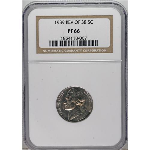 <B>1939 5C Reverse of 1938 PR66 NGC.</B></I> NGC Census: (0/0). PCGS Population (38/16). Numismedia Wsl. Price for NGC/PCGS coin in PR66: $800. (#94176)<BR><BR><b>Shipping:</b> Coins & Currency (<a target="_blank" href="http://www.heritageauctions.com/common/shipping.php">view shipping information</a>)
