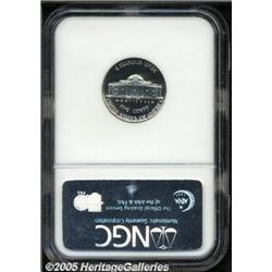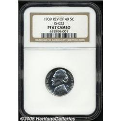<B>1939 5C Reverse of 1940 PR67 Cameo NGC.</B></I> FS-023. Both sides are uniformly reflective with a bright, essentially untoned appearance over both sides. Only a small percentage of the proof Nickels from 1939 exhibit the sharp steps of 1940, a hub design change that wasn't fully implemented until 1941.