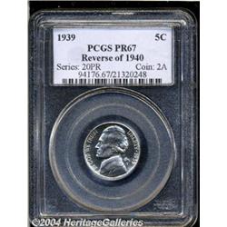 <B>1939<5C> Reverse of 1940 PR67 PCGS.</B></I> The reflective fields highlight the mildly frosted devices, particularly on the reverse. A tiny toning spot in the field between Jefferson's mouth and the D in GOD is mentioned for accuracy. Population: 10 in 67, 0 finer (3/04). <BR><BR><B>Important notice:</B> Heritage usually auctions material at the rate of 200-250 lots per hour. On some occasions eBay Live bid software or the Internet may not be able to keep up with the pace of the auction. We recommend placing a realistic absentee bid now as insurance to avoid disappointment. Occasionally the auctioneer may eliminate or reject an eBay Live bid, and the auctioneer may also reopen a lot after the close of the eBay live bidding (usually because we missed an audience bid), and may reject your bid even if it shows you as the winning bidder. By bidding via eBay Live, you agree that Heritage may award the lot to another bidder at its sole discretion under the circumstances described above or any other reasonable circumstances. Since eBay bids are not shown to us until we open the lot on the floor, we treat those bids just like floor bids. In most cases the floor responds before the eBay bid is presented to us, due to Internet lag time, so for consistency we have made it a policy that floor bids are always considered first over tie eBay live bids. Also please note that all Heritage lots purchased through eBay Live carry a 20% Buyer's Premium. Please make sure you read the Terms and Conditions before you bid.