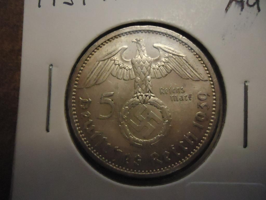 1939-A GERMAN SILVER 5 MARKS AU WITH SWASTIKA