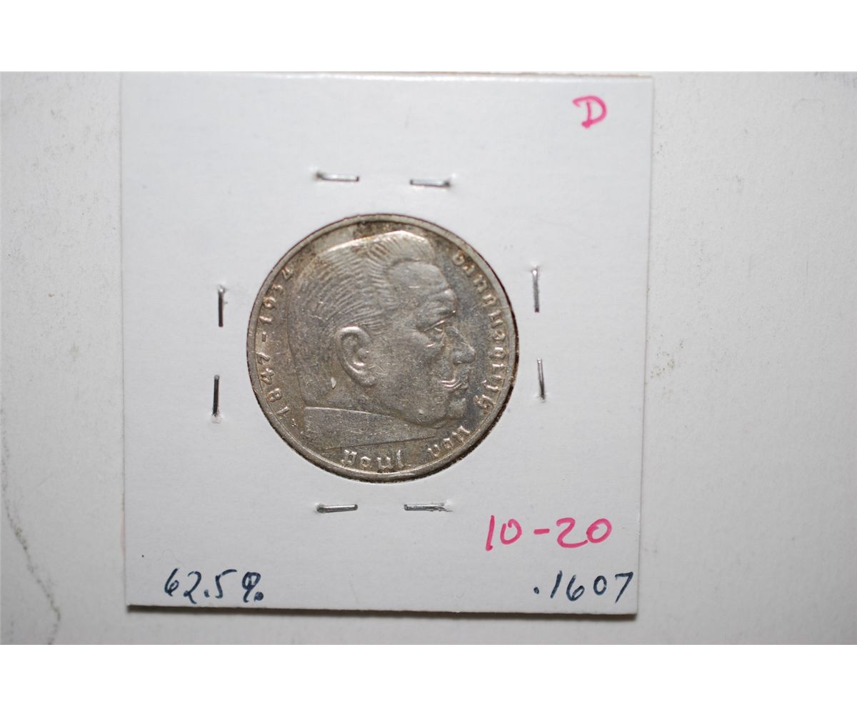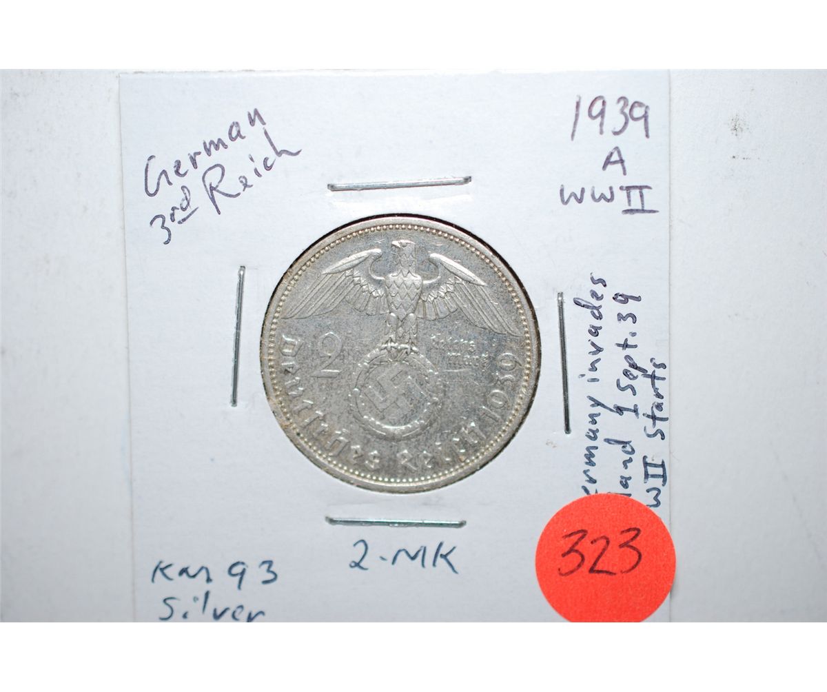 1939-A German 2 Deutsche Mark Foreign Coin With Flying Eagle Holding Swatstika; WWII Germany Invades Poland Sept. 1, 1939; Silver .1607; EST. $10-20