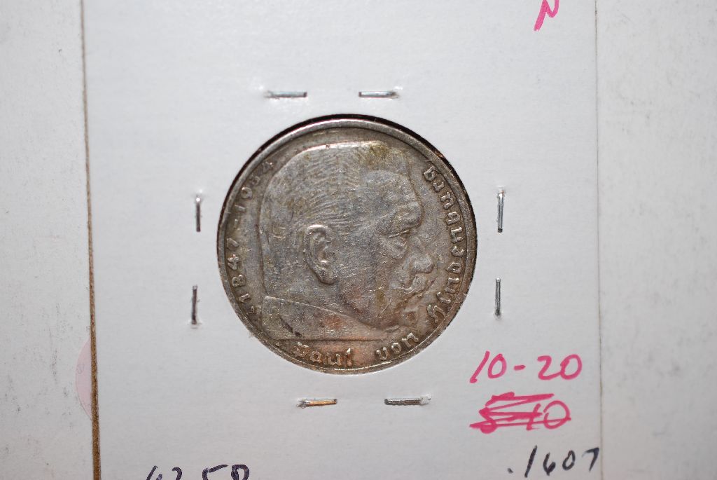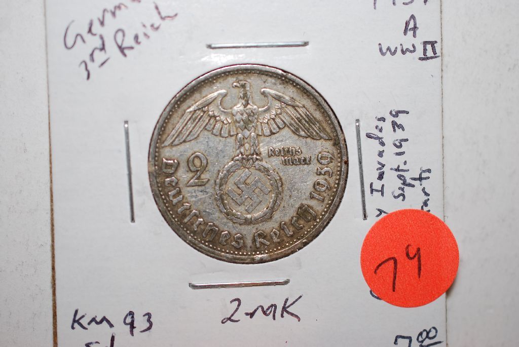 1939-A German 2 Deutsche Mark Foreign Coin With Flying Eagle Holding Swatstika; WWII-Germany Invades Poland Sept. 1, 1939; Silver .1607; EST. $10-20