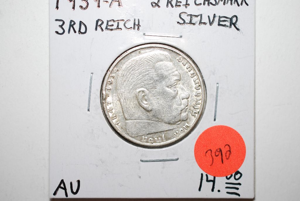 1939-A German 2 Reichsmark Foreign Coin With Flying Eagle Holding Swatstika; AU; Silver; EST. $10-15